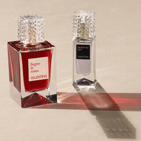 The rectangular glass bottle stands the true test of time. A transparency evincing that there is nothing to hide yet everything to discover. The studded cap made of glass echoes Maison Valentino’s signature emblem, the stud, a square and cruciform shape that pays homage to Rome and to the bugnato found on the Roman Palazzos. A recognizable insignia that has expressed the Maison’s identity over time.