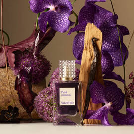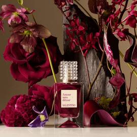 A Valentino perfume bottle placed beside deep red flowers and textured natural elements against a soft, light background.